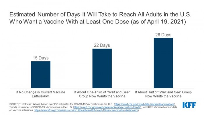 根据 Kaiser Family Foundation 本周发布的一份报告,美国即将达到这个拐点。因为几乎所有最渴望接种疫苗的人都已经打过疫苗了。3 月底的民意调查发现,61% 的美国成年人希望尽快接种疫苗--大约有 1.57 亿人。报告中写道:“一旦发生这种情况,鼓励接种疫苗的努力将变得更加困难,对达到预期所需的群体免疫水平提出了挑战”。