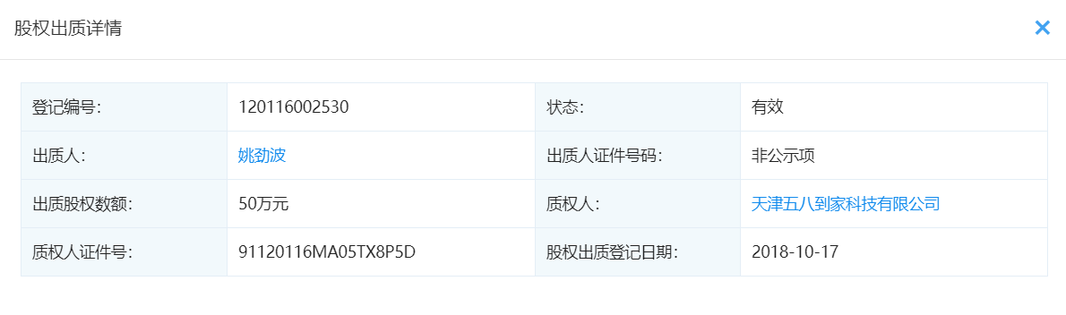 对此,快狗方面称,公司对此事并不知情。但企查查显示,早在2018年10月,快狗打车母公司天津五八到家货运服务有限公司的两位股东:姚劲波与陈小华,就各出质了50万元股权给天津五八到家科技有限公司,而该公司由58 Freight Holdings Limited100%持股。
