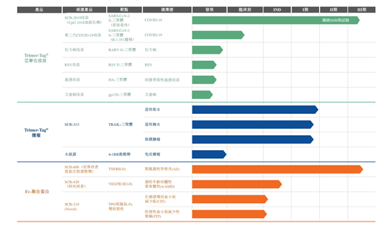 截至最后实际可行日期,公司的产品管线包括(i)六种Trimer-Tag亚单位候选疫苗、两种Trimer-Tag肿瘤候选产品及三种Fc融合候选产品,涵盖13种适应症,已启动有九项临床试验。