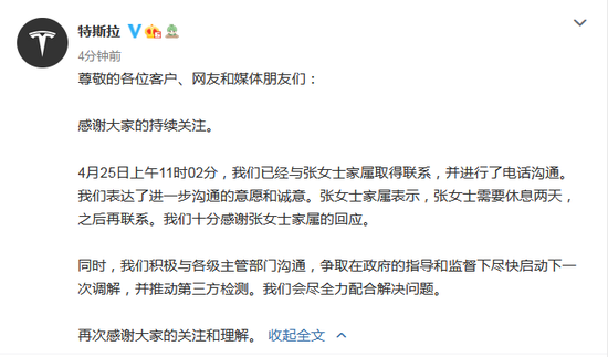 特斯拉官方微博称:4月25日上午11时02分,我们已经与张女士家属取得联系,并进行了电话沟通。我们表达了进一步沟通的意愿和诚意。张女士家属表示,张女士需要休息两天,之后再联系。我们十分感谢张女士家属的回应。同时,我们积极与各级主管部门沟通,争取在政府的指导和监督下尽快启动下一次调解,并推动第三方检测。我们会尽全力配合解决问题。