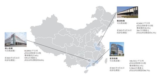 根据招股书,以上所有物业均为现代物流地产,包含配备有自动分拣及供应链支持设施的分拨中心。于2020年12月31日,可出租总面积为307,617.5平方米,评估价值为60.999亿港元,物业的平均出租率约为95.3%。各物业均位于香港及中国主要物流枢纽内,毗邻主要机场、海港、铁路、高速公路及交通枢纽。