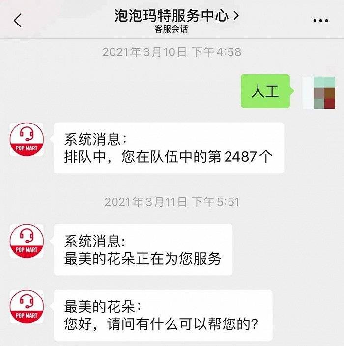 泡泡玛特近两年的售后服务也备受诟病,有玩家吐槽:“我找泡泡玛特小程序人工客服,每次前面基本都有两三千人排队,有一次下午5点排队,结果第二天下午6点才排到。玩家群里很多人吐槽,泡泡玛特市值都这么高了,就不能多请一些客服?”