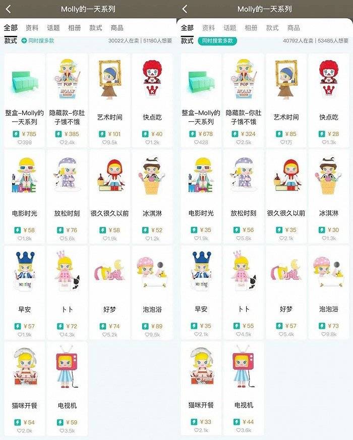 果不其然,4月中旬以后,该系列价格突然腰斩,经过十多天的持续走低,目前该系列盲盒价格已经和其他系列基本持平。