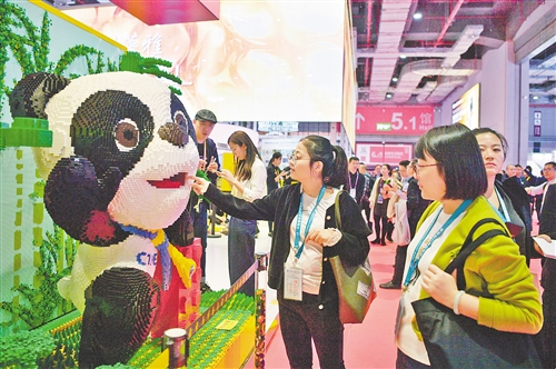图③ 第二届进博会科技生活展区,乐高版的“进宝”吸引参观者驻足。 本报记者 高兴贵摄