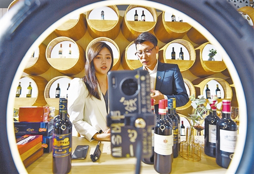 图② 第三届进博会食品及农产品展区,参展商通过网络直播在线上展台展示商品。