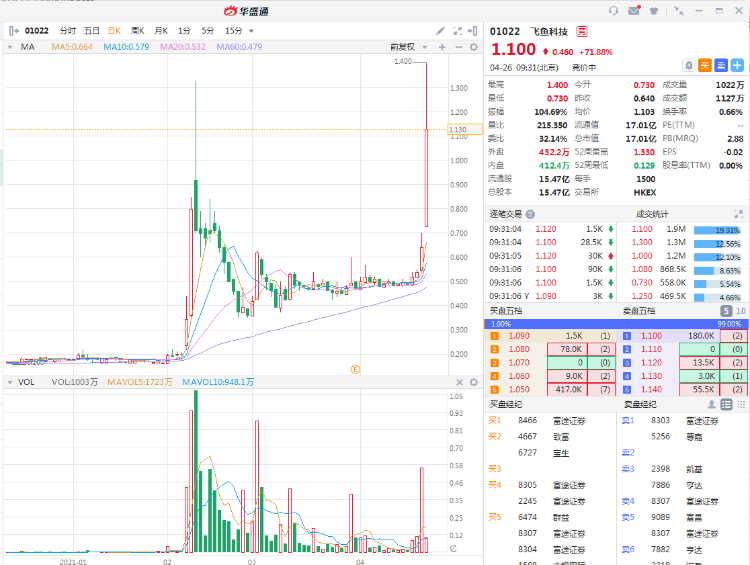 公告称,认购方为腾讯控股(00700)的全资附属公司。截至发稿,飞鱼科技涨71.89%,报1.1港元,成交额1127万港元。