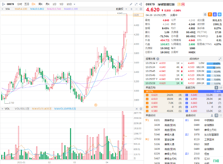 延续近期强势,绿城管理控股(9979.HK)今日盘中继续拉升,涨8.96%报4.62港元,创历史新高,市值90.45亿港元。