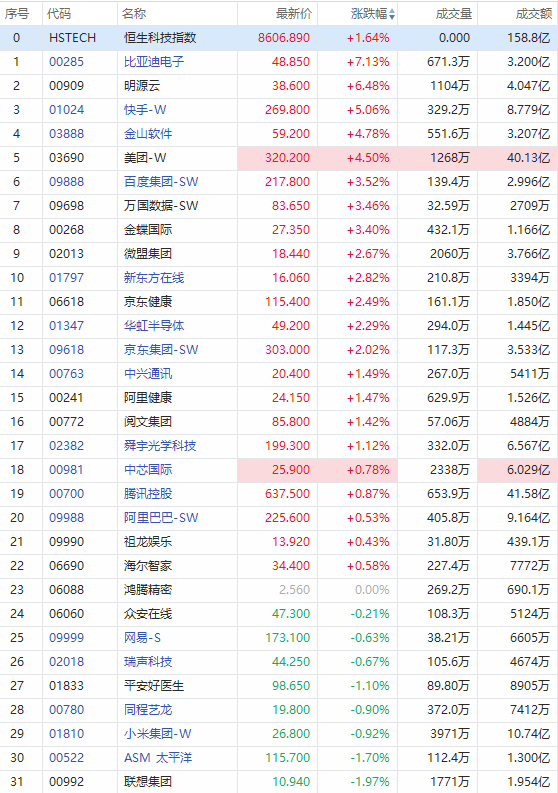 比亚迪电子涨超7%;明源云涨超6%;快手-W涨超5%;美团-W涨超4%;百度集团-SW涨超3%;新东方在线、京东集团-SW涨超2%。