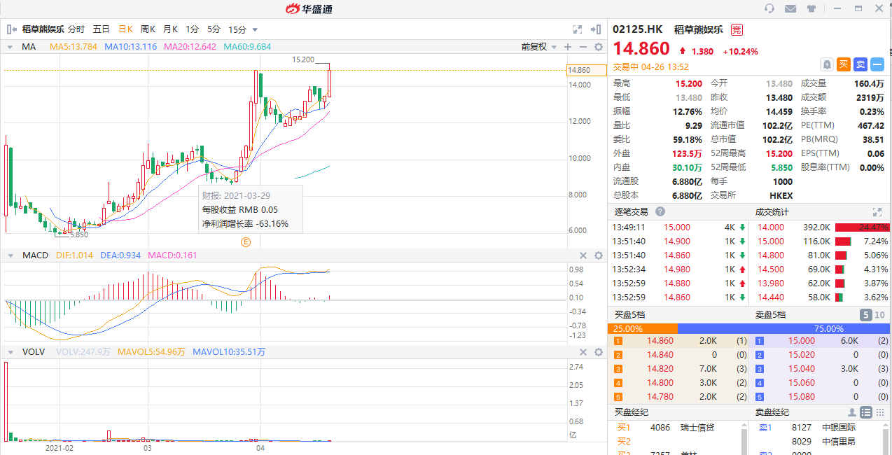 华盛资讯4月26日消息,次新股稻草熊娱乐今日股价创新高,盘中大涨10%,现报14.86港元每股,最新总市值为102.2亿港元,一个月累计涨超45%。