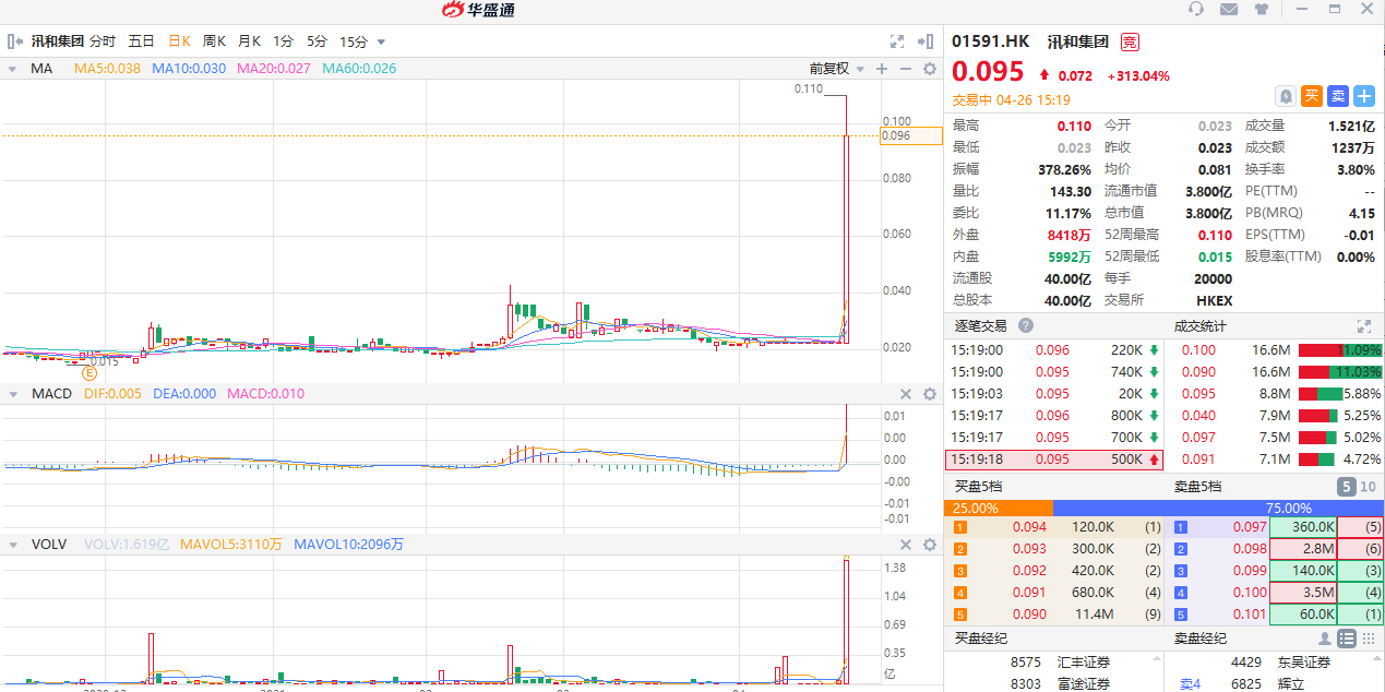 华盛资讯4月26日消息,讯和集团盘中突遭直线拉升,股价狂飙超300%。目前涨313.04%,报0.095港元每股,成交额达1237万港元。