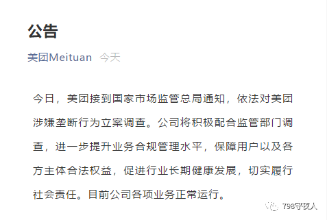 美团随后回应称,今日,美团接到国家市场监管总局通知,依法对美团涉嫌垄断行为立案调查。公司将积极配合监管部门调查,进一步提升业务合规管理水平,保障用户以及各方主体合法权益,促进行业长期健康发展,切实履行社会责任。目前公司各项业务正常运行。