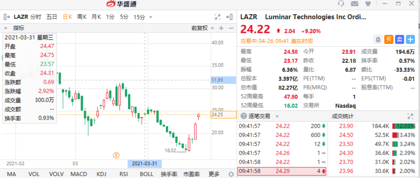 华盛资讯4月26日讯,激光雷达板块集体飙升,维视图像(MVIS)涨23%,Luminar(LAZR)涨超9%,Velodyne(VLDR)涨7%。