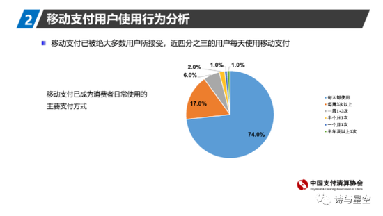 据中国支付清算协会数据,近四分之三的用户每天使用移动支付,99%的用户每月至少使用一次移动支付。