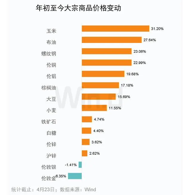 以布伦特原油为例,今年年初价格尚在51美元/桶左右,4月中下旬则在65美元/桶左右震荡,年内涨幅超过27%。4月26日,普氏62%铁矿石价格指数突破190美元/吨,创出10年新高。4月26日,CBOT大豆期货结算价达到1539美分/蒲式耳,为7年新高。
