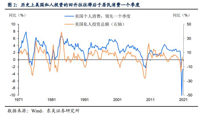 更有趣的是,美国私人投资往往是居民消费的派生需求。如下图所示,历史上美国私人固定投资在增速上往往滞后于居民消费一个季度,这就意味着如果2021年一季度美国居民消费录得强劲扩张,二季度私人投资也有望迎头跟上,再叠加同期房地产市场的持续复苏和政府支出的加大,无疑将对全球经济和大宗商品产生正的外溢效应。
