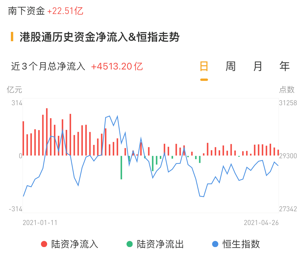 南下资金今日净流入22.51亿港元,前一交易日净流入超32亿港元。