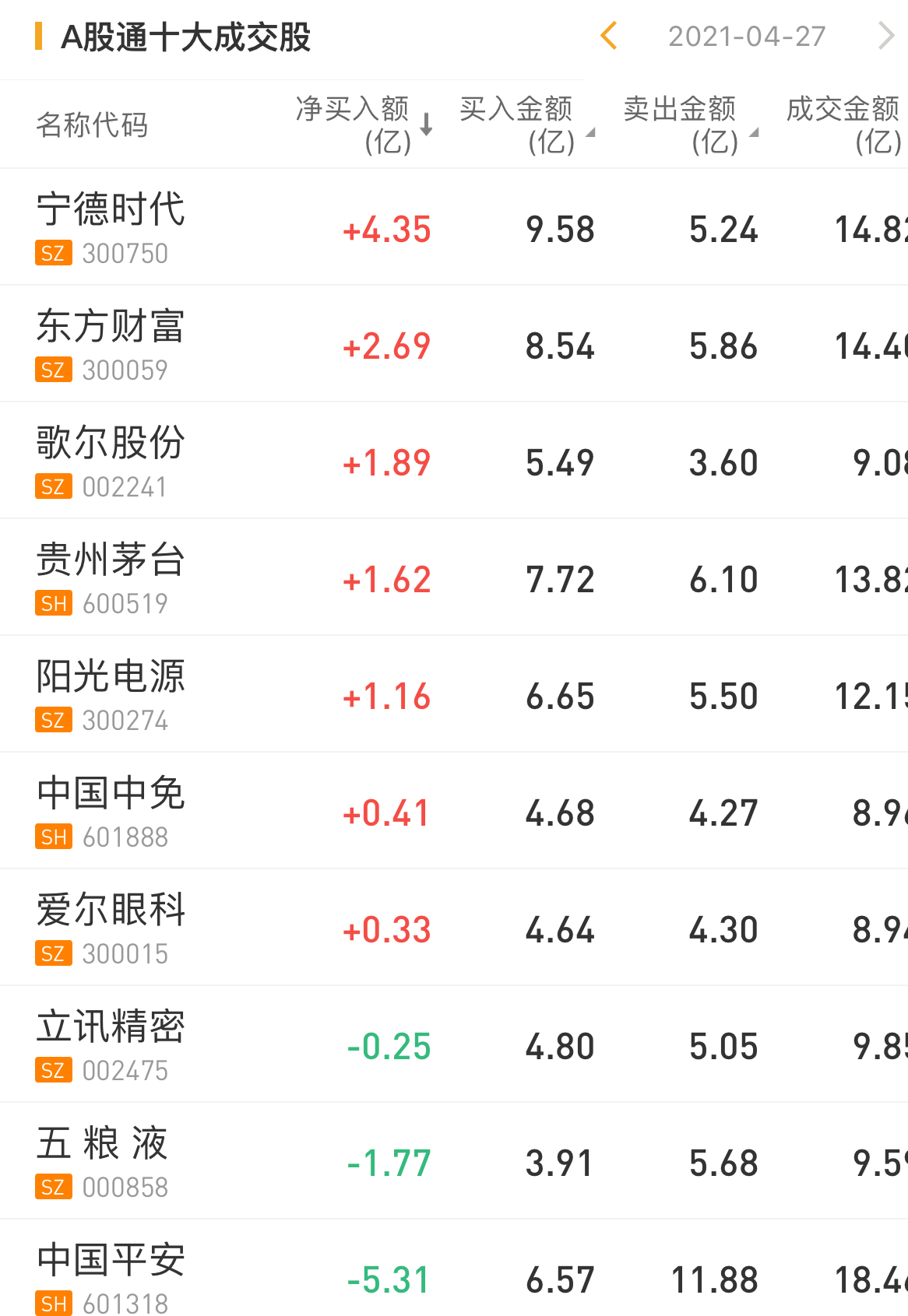 北上资金今日净买入宁德时代4.35亿元,为今日买入之最。此外,东方财富也获买入2.69亿元。