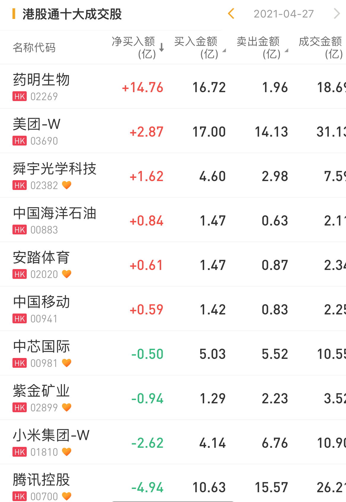 个股方面,今日南下资金净买入药明生物,净买入额达14.76亿港元,为今日买入之最。此外,还买入美团-W 2.87亿港元。