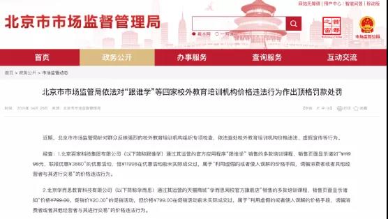 4月25日,北京市市场监管局发布消息,针对群众反映强烈的校外教育培训机构组织专项检查,依法查处校外教育培训机构利用“划线价”诱骗交易和虚假宣传等行为。其中,跟谁学、学而思、新东方在线、高思四家校外教育培训机构,被顶格罚款50万元。