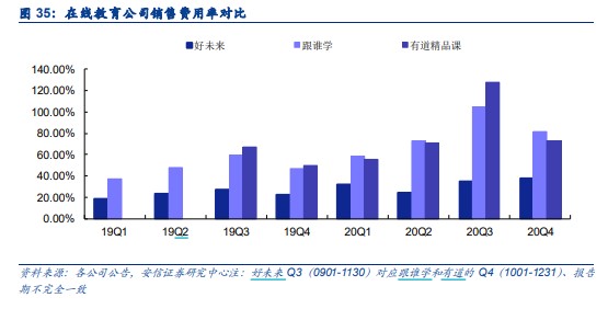 在线教育公司营销费用增长明显,特别是在寒暑假招生季度增长更甚。从上市公司财报看,部分公司销售费用率可达到100%以上。