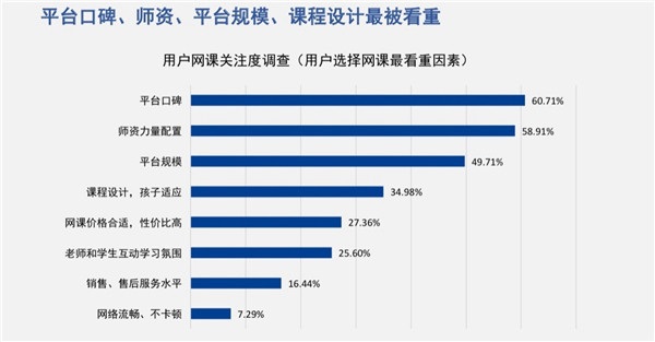 中科院发布的调研报告显示,近50%的家长选择在线教育平台时,更看重平台口碑,紧随其后为平台价格、师资,平台服务和资质等往往不做重点参考。