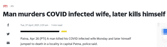 据印度报业托拉斯(PTI)26日报道,当地警方表示,在巴特那某地,一名男子周一用利器杀害了自己感染新冠病毒的妻子后,跳楼自尽。