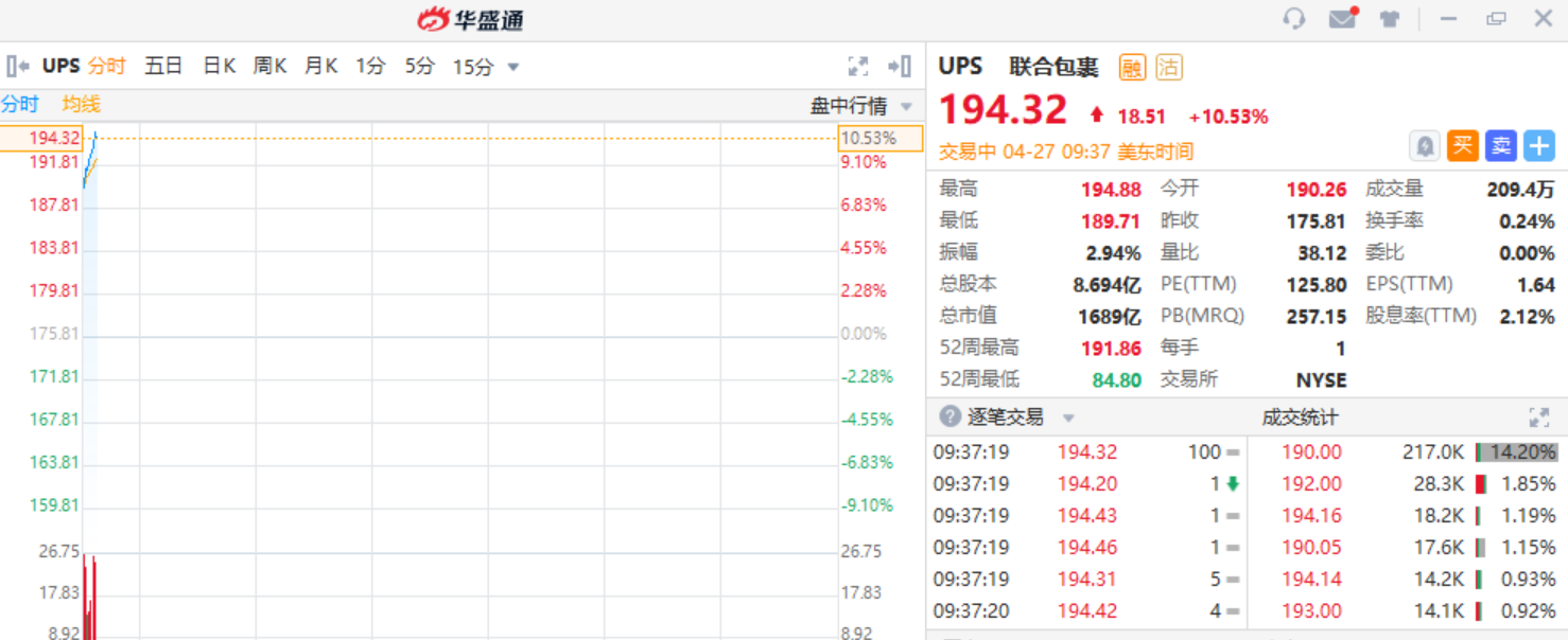 华盛资讯27日消息,周二美股盘初,联合包裹股价上涨,截至发稿,该股涨10.53%,报194.32美元。该公司2021年第一季度营收为229亿美元,同比增长27%;净利润为47.92亿美元;运营利润为28亿美元,同比增长158%。