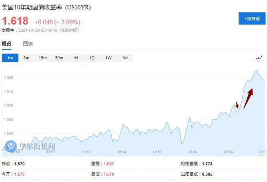 美股午盘时段,7年期美债标售结果出炉后,基准10年期美国国债收益率曾短线回落,降至1.60%下方,后很快继续攀升,一度升破1.62%刷新一周高位,日内整体涨幅超过5.5个基点,标售结果公布以来上扬约3个基点,较今年3月30日升破1.77%所创的14个月高位仍有距离。
