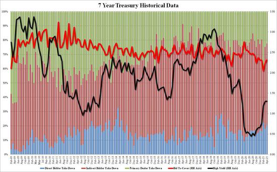 华尔街见闻此前文章提到,今年2月25日,美国财政部拍卖620亿美元的7年期国债,得标利率为1.195%,创2月以来最高的截标收益率,认购倍数仅为2.04,创历史新低。当时有评论称,这意味没有外国投资者想要美国国债了,这绝对堪称多年来7年期美债拍卖的最尴尬和最具灾难性的时刻。