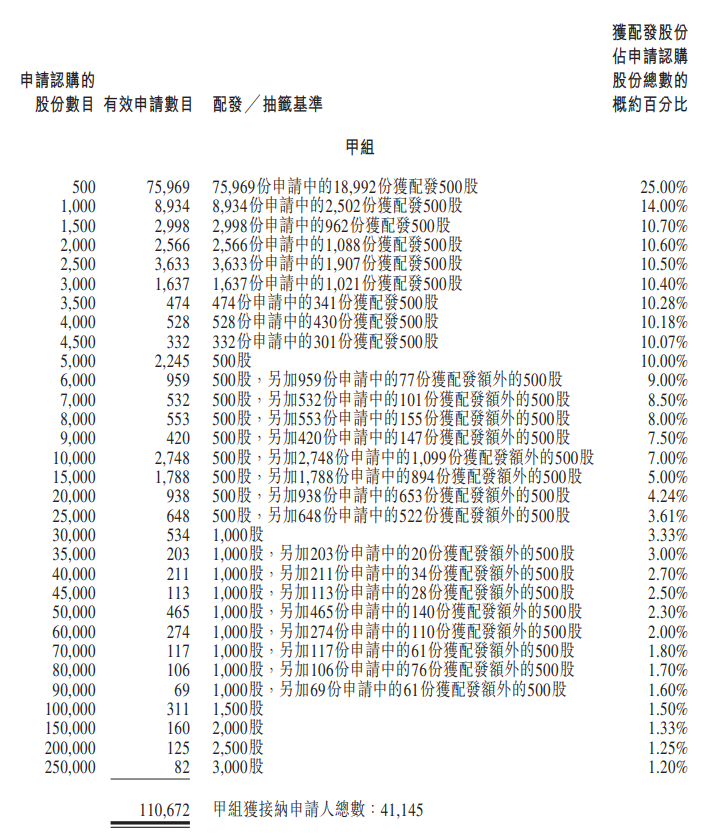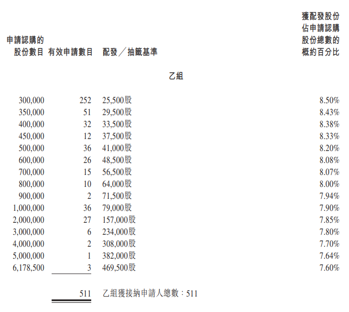 公开发售一手中签率25%,申购10手稳获一手,乙头获配51手。