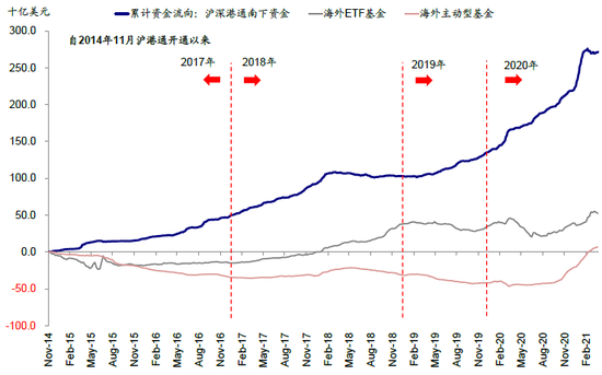 图表:沪深港通南向 vs. 海外资金主被动资金流入情况