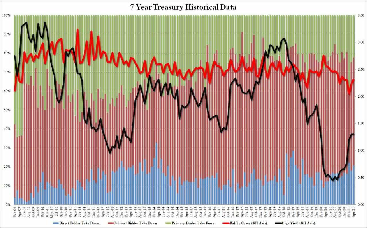 认购情况也同样稳健。包括美联储和其他美国联邦政府实体在内的直接购买人(Direct)获配20.6%,远高于上月的18%和近期的均值17.1%;包括外国央行在内的间接购买人(Indirects)获配比率为57.1%,略低于上月的57.3%,低于最近六次的均值57.7%,但明显高于2月的38.1%;而具有购买所有未能拍出国债以防止拍卖流产义务的一级交易商(Dealers)获配比例只有22.3%,创今年1月以来新低,远低于近期均值25.2%。