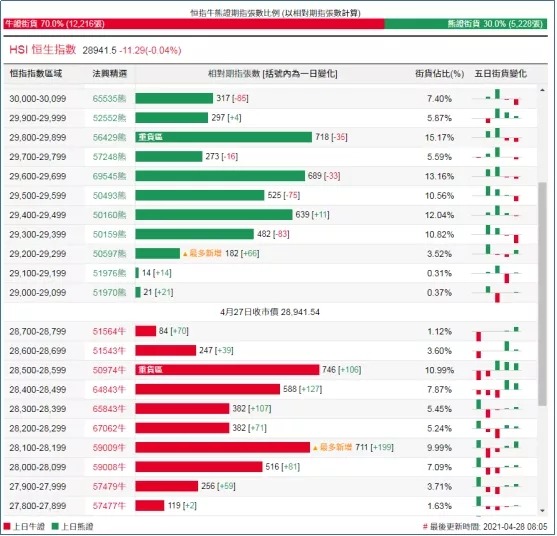 街货分布方面,至周二,恒指牛证街货在收回价28300点至28800点之间,累计相当约1338张期指合约;恒指熊证街货在收回价29000点至29500点之间,累计相当约2631张期指合约。