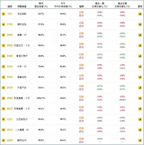 周二恒指相关权证的平均引伸波幅明显上调,报约19.4%。个股方面,百度、京东相关认购证的引伸波幅按日有所下调;汇丰、百度、京东相关认沽证的引申波幅按日调降。