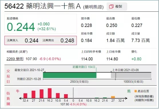 1、强势轮证:药明法兴一十熊(56422.HK),周二上涨32.61%;
