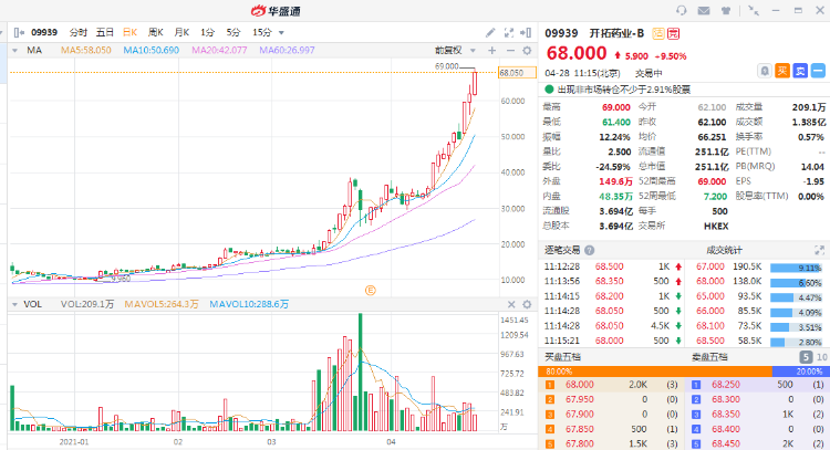 开拓药业-B(09939)近两月获资金持续追捧,年内累计涨幅超550%。该股今日盘中高见69港元,再创历史新高。截至发稿,涨9.50%,报68港元,成交额1.385亿港元。