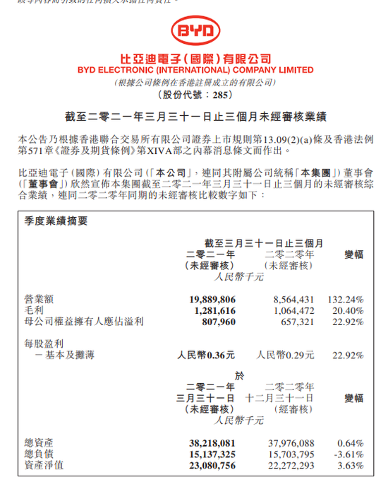 4月28日消息,比亚迪电子在港交所披露2021年第一季度未经审核业绩,公司2021年Q1营收198.9亿元,去年同期85.64亿元,同比增长132.24%。