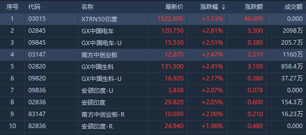 受消息影响,今日港股涨幅居前的ETF有GX中国电车涨2.81%,成交额2098万港元;安硕印度涨2.05%;GX中国生科涨2.41%,成交额858.4万港元。