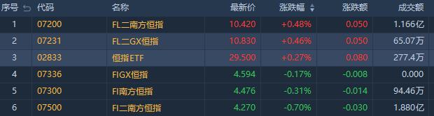 受消息影响,今日港股涨幅居前的ETF有南方两倍看多恒指(07200.HK)涨0.48%,成交1.17亿港元;南方两倍看空恒指(07500.HK)跌0.7%,成交1.88亿港元。
