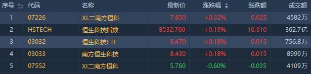 看多恒指相关ETF走强,南方两倍做多恒科(07226.HK)涨0.32%,成交额约4582万港元。