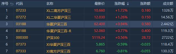 沪深300指数收涨056%。其中,华夏两倍做多沪深三(07272.HK)涨1.26%;华夏沪深三百ETF(03188.HK)收涨0.94%,成交额2.22亿港元。