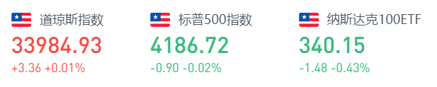 截至收盘,道琼斯指数涨3.36点,涨幅0.01%,报33984.93点;标普500指数跌0.9点,跌幅0.02%,报4186.72点;纳斯达克综合指数跌48.56点,跌幅0.34%,报14090.22点。