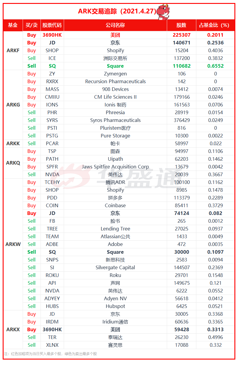 ARK基金每日持仓报告显示,4月27日,ARK旗下三只ETF——ARKF、ARKW、ARKX——共计买入京东244800股,若按当日收盘价78.46美元/股计算,市值约为1920.7万美元。此外,ARKW买入拼多多113379股,按该公司收盘价140.08美元/股计算,市值约为1588.2万美元。