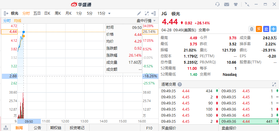 极光涨超26%。投资银行和知名研究机构Oppenheimer昨日发布研报首次覆盖极光,给予“优于大市”评级,目标价6美元。
