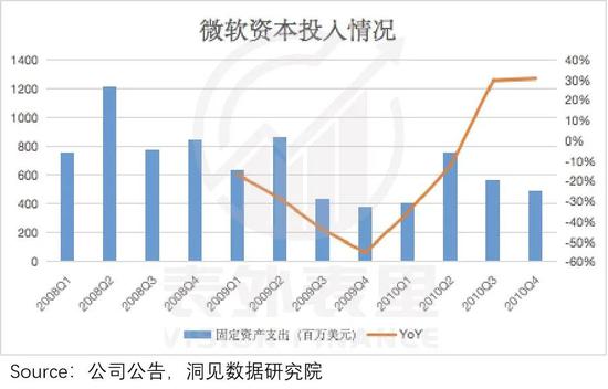 软件出身的微软,一开始以PaaS层切入云计算。但没有IaaS基建基础在,PaaS层的发展是受限的。可以看到,微软早期的资本支出在逐渐缩减。