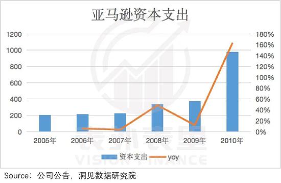从2006年开始,亚马逊的资本支出持续上涨,经历2008年金融危机,也没有缩减支出,只是增速有所放缓,2010再次大幅增加支出。