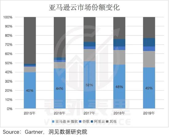 而它们侵占的即是AWS的IaaS市场:从2017年占比52%降到2019年的45%。