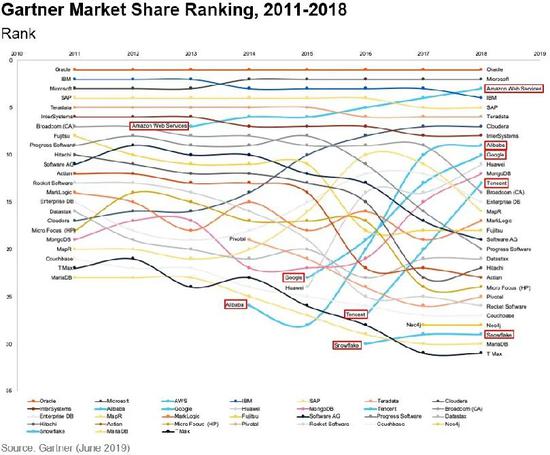 根据Gartner报告,AWS、阿里云、谷歌云等云数据库提供商市场份额明显上升,有望在2021年占比达到50%。
