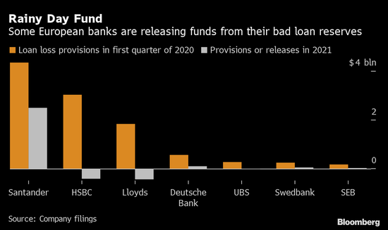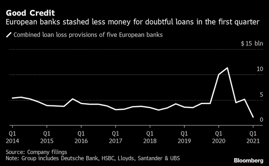 到目前为止已经发布第一季度财报的欧洲大银行,几乎都报告提取坏账拨备低于上年同期或释放了坏账拨备,利润水平得以提高。德意志银行、桑坦德银行和劳埃德银行集团都表示,乐观的经济前景证明了此举的合理性。