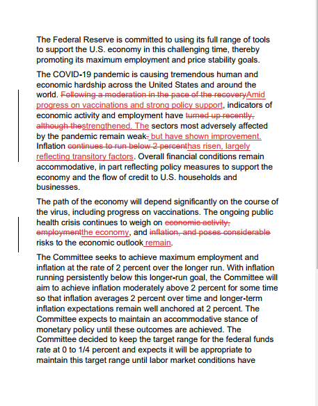 新冠疫情给美国和世界各地的人们和经济造成了巨大的困难。随着疫苗接种取得进展和强有力的政策支持,经济活动和就业指标有所加强。受大流行病不利影响最大的部门仍然薄弱,但已显示出改善。通货膨胀率上升,主要反映了暂时性因素(尽管受疫情影响最严重的部门仍然疲弱,复苏步伐温和,近期经济活动和就业指标有所回升。通胀率继续低于2%)。整体金融状况保持宽松,这部分是因为支持经济的政策措施以及流向美国家庭和企业的信贷。